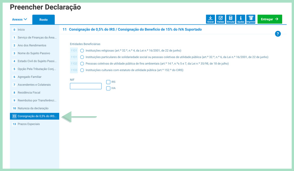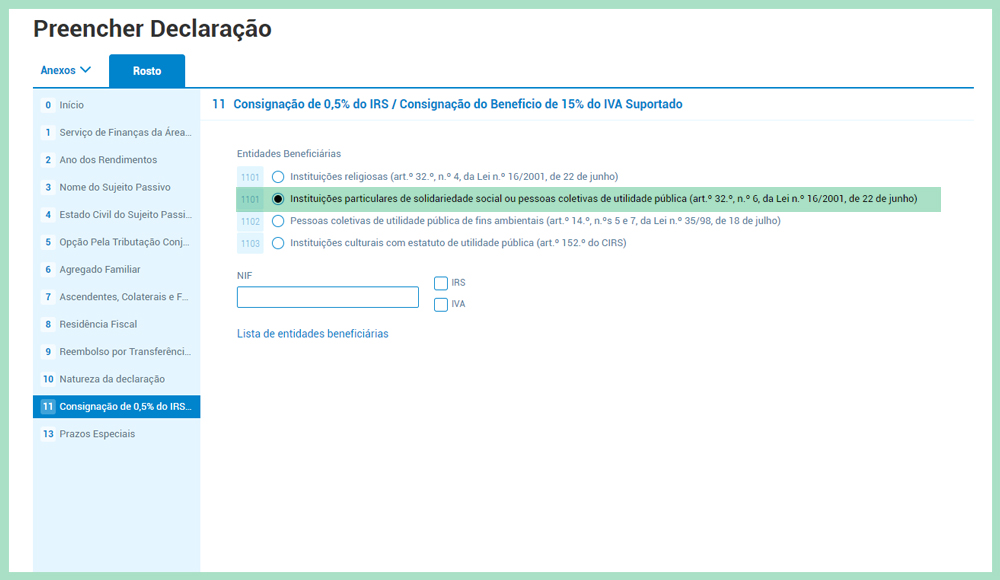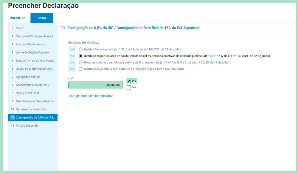 Escolha a entidade a quem pretende consignar o IRS ou IVA (no Portal da Autoridade Tributária).